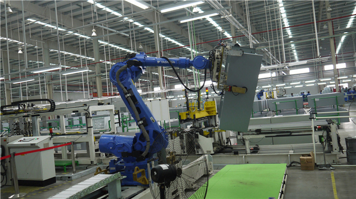 3、壓縮機(jī)自動(dòng)化組裝。冰箱發(fā)泡后豎身45度、由機(jī)械手固定安裝壓縮機(jī)的工裝設(shè)備,目前已投入實(shí)際應(yīng)用。機(jī)器人識(shí)別、搬取、固定壓縮機(jī)的裝備技術(shù),改變了原先操作工身兼搬運(yùn)工、甚至焊接工的情況,明顯降低了現(xiàn)場(chǎng)工人的勞動(dòng)強(qiáng)度,成為冰箱生產(chǎn)自動(dòng)化的重要環(huán)節(jié)之一。