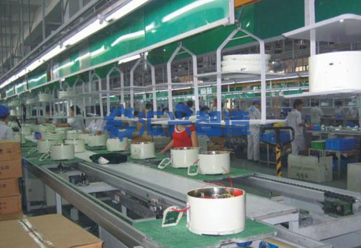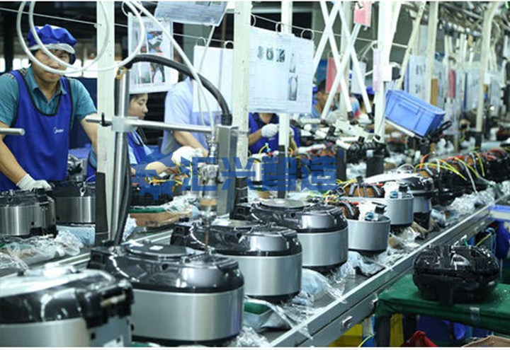 匯興智造電飯煲整廠自動(dòng)化生產(chǎn)線是由各式差速鏈裝配檢測(cè)線、懸掛輸送裝配線、輥道輸送裝配線、鏈板式電機(jī)浸漆線、電飯煲測(cè)試檢測(cè)線組成,另外包括自動(dòng)噴涂設(shè)備、頂升平移機(jī)、打包機(jī)等各類專機(jī)設(shè)備,共同完成電飯煲的生產(chǎn)任務(wù)。