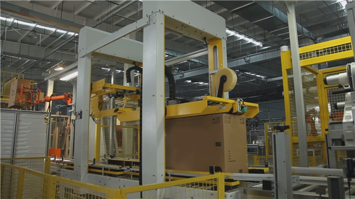 自動包裝系統(tǒng)由自動繞膜機、自動開箱、套箱、自動打釘、打包機、自動化下線機等組成: