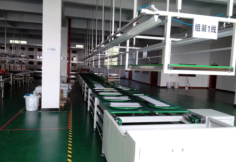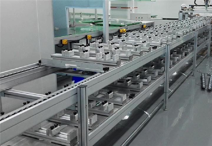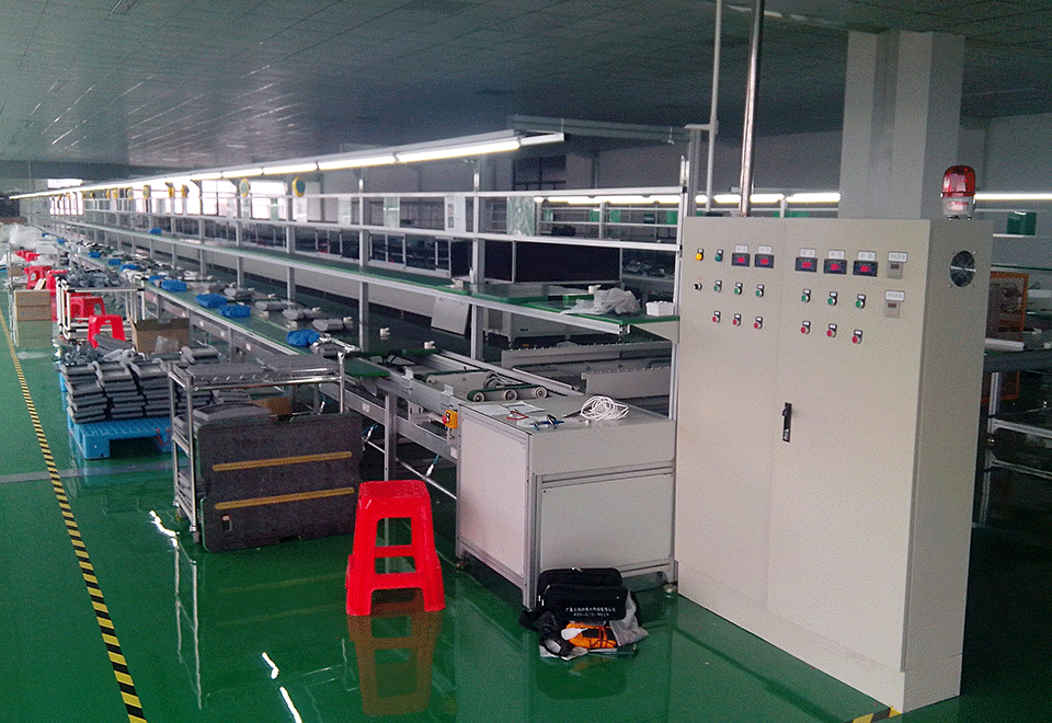 來料測試線機架腳架采用優(yōu)質方通組焊制作,每2米一段,采用鍍鋅可調腳杯;線體皮帶護邊采用方管制作,沿線體兩側一路布置;承載采用鍍鋅滾筒,中心間距200㎜安裝一條,全線布置;輸送帶采用綠色PVC防靜電皮帶,厚2mm、寬500mm無縫熱縮接駁,皮帶面低于機身護邊8㎜;照明系統(tǒng):采用優(yōu)質方管組焊制作,選用40W單支帶罩T8電子節(jié)能支架,全線布置。工作臺: 配對面坐工作臺,優(yōu)質木夾板制作,面貼綠色防靜電膠皮,半圓木條包邊。