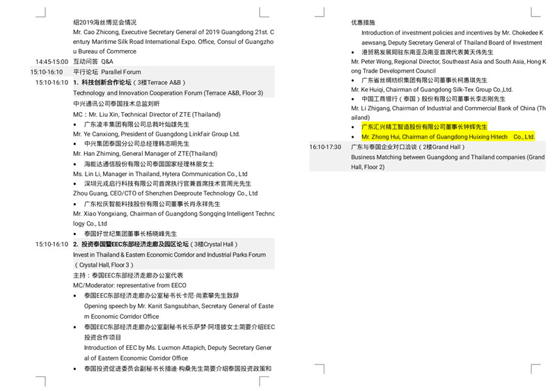 在交流會(huì)《投資泰國(guó)暨EEC東部經(jīng)濟(jì)走廊及園區(qū)論壇》環(huán)節(jié),匯興智造董事長(zhǎng)鐘輝先生作為廣東企業(yè)代表作分享交流。鐘輝表示,面對(duì)新形勢(shì),企業(yè)家應(yīng)有三個(gè)思維,即互聯(lián)網(wǎng)思維、國(guó)際化思維和產(chǎn)業(yè)金融思維?!耙粠б宦贰背h的實(shí)施和粵港澳大灣區(qū)建設(shè)為中泰企業(yè)帶來(lái)重大發(fā)展機(jī)遇,企業(yè)“走出去”需要結(jié)合所在國(guó)家國(guó)情,創(chuàng)新思路,積極與國(guó)際及本土知名企業(yè)合作,使“走出去”的力量更強(qiáng)大、更深入。
