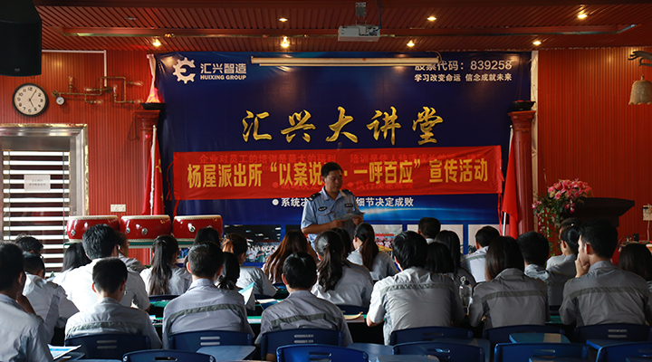 為進(jìn)一步增強(qiáng)廣東匯興精工智造股份有限公司(股票代碼:839258)全體員工的自我保護(hù)意識(shí),提高自我防范能力,預(yù)防和減少詐騙跟盜搶性案件的發(fā)生, 7月29日下午,匯興智造特邀楊屋派出所民警走進(jìn)企業(yè),為全體員工開(kāi)展“防騙、防搶”安全知識(shí)講座。公司全體辦員工代表共計(jì)40人在匯興學(xué)校聆聽(tīng)精彩的講座。