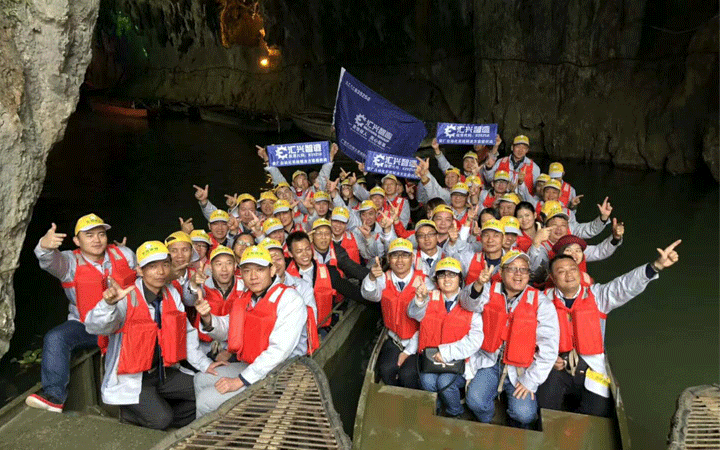 旅途第三站:洞天仙境。洞口有一巨大的鐘乳石向下垂吊,從巖洞口乘船而入,在眾多奇姿怪態(tài)的鐘乳間穿掠。穿過一段狹窄的地方進(jìn)入到洞內(nèi),視野豁然開朗,有綠樹、蔓草、野花,抬頭仰望,洞中有天,洞天相連,讓人嘆為觀止?!皦粝胫谩钡膱F(tuán)隊(duì)成員們在感嘆大自然的神奇時,也表示天外有天,人外有人,只有不斷前行,才有更廣闊的天地。邊走邊看,邊看邊想,“夢想之旅”讓匯興智造的骨干們看得更遠(yuǎn),想得更深,真是不虛此行。