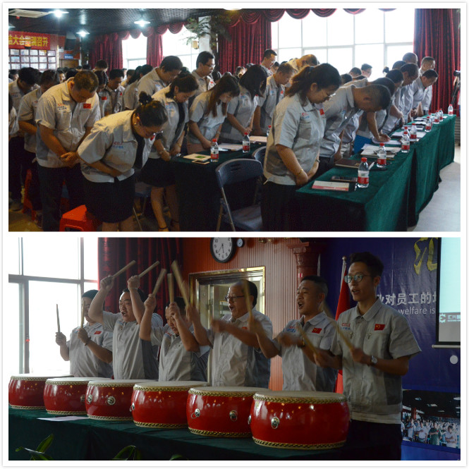 會(huì)議由配件事業(yè)部副總監(jiān)楊思主持。會(huì)議在激昂的《匯興之歌——用心智造世界》拉開帷幕,全體參會(huì)人員向企業(yè)“孝道、商道、人道”行三鞠躬禮,宣讀企業(yè)愿景——成為中國(guó)領(lǐng)先的整廠自動(dòng)化系統(tǒng)解決方案提供商,企業(yè)使命——做受尊敬的好人、造受尊敬的產(chǎn)品、辦受尊敬的企業(yè)、建受尊敬的平臺(tái),企業(yè)精神——用情做人、用心做事,團(tuán)隊(duì)精神——忠誠(chéng)團(tuán)結(jié)、勤奮進(jìn)取。隨后,匯興智造董事長(zhǎng)鐘輝帶領(lǐng)子公司、分公司、辦事處領(lǐng)導(dǎo)共同敲響士氣鼓,鼓舞匯興智造牢記初心,砥礪前行。