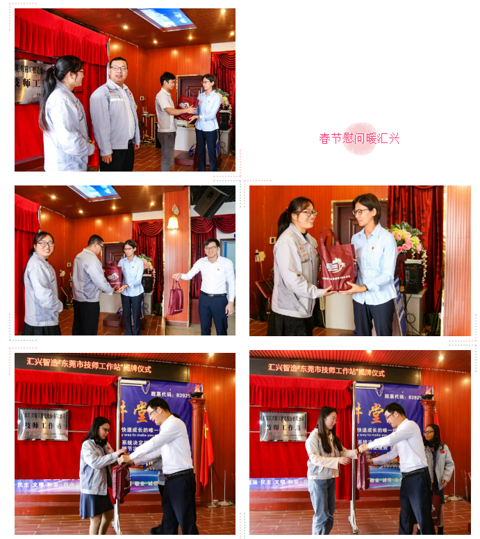 鐘輝董事長向蒞臨此次揭牌儀式的領導致以衷心的感謝。首先作了企業(yè)人才培養(yǎng)及規(guī)劃報告,表示公司一直秉承“創(chuàng)于手、精于工、智于器、匠于心”的工匠精神,任何事情都要精益求精、鍥而不舍,把手頭上的事情做到極致。接下來,將積極發(fā)揮技師工作站的指導作用,致力于發(fā)展高技能人才培養(yǎng)計劃。他強調,感謝東莞這片沃土,讓我們努力在2019年實體經(jīng)濟發(fā)展面臨著國內外復雜的嚴峻形勢下,公司仍能在逆境中實現(xiàn)增長。未來,匯興將更加重視技能人才的引進和培養(yǎng)工作,充分發(fā)揮高技能人才引領帶動作用,推動高技能人才隊伍建設,增強企業(yè)創(chuàng)新能力和核心競爭力,把工作站的實際工作轉化為技術改革和提升人才素質的力量源泉,為公司的發(fā)展提供有效的技能人才支撐,為東莞市打造“技能人才之都”城市貢獻一份力量。會后,大嶺山人社分局春運有序流動領導小組與匯興員工面對面交流,并送上春節(jié)慰問品,政府“送政策”“送溫暖”暖企暖心活動細節(jié),如同這寒冷的冬季中最溫暖人心的一抹陽光,讓與會員工代表非常感動如沐春風倍感溫暖。技師工作站是東莞市新型高技能人才培養(yǎng)模式載體,是指承擔制訂技師培養(yǎng)規(guī)劃,開展技術培訓,多渠道加快培養(yǎng)高技能人才,總結推廣技師培養(yǎng)經(jīng)驗,普及應用生產(chǎn)技能等活動,并建立技能人才和技能開發(fā)成果信息庫,展示技能創(chuàng)新成果的工作室,進而推動行業(yè)、企業(yè)產(chǎn)業(yè)升級和技術進步。匯興智造在智能制造領域擁有近20年的研發(fā)、設計、實施、應用經(jīng)驗,通過打造智能裝備全產(chǎn)業(yè)鏈產(chǎn)品(智能裝備硬件+系統(tǒng)軟件+系統(tǒng)服務),賦予傳統(tǒng)生產(chǎn)制造業(yè)更智能的元素,并用具性價比的整廠自動化系統(tǒng)解決方案幫助更多企業(yè)解決生產(chǎn)制造的痛點。此外,公司還獲批建立了“廣東省院士專家企業(yè)工作站”、“東莞市院士工作站”、“省級博士后創(chuàng)新實踐基地”、“廣東省智能制造系統(tǒng)工程技術研究中心”、“東莞市研究生培養(yǎng)工作站”、“東莞市技師工作站”、“江西理工大學先進制造技術研發(fā)中心”、“南昌大學機電工程學院研究生聯(lián)合培養(yǎng)基地”、“南昌大學機電工程學院研究生實踐基地”、“東莞理工學院教學實習基地”、“東莞理工學院城市學院就業(yè)實習基地”、“東莞職業(yè)技術學院校企合作伙伴單位”等多個科研平臺,這些科研平臺的引進為技師工作站建設賦能。