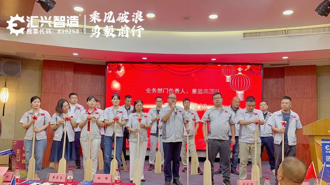 參會現(xiàn)場董監(jiān)高上臺在沒有任何彩排的情況下,進行劃龍舟展示,在鐘董的指揮下,整齊劃一的劃動船槳。意在把團結拼搏、奮勇向前的龍舟精神轉化為推動匯興智造高質量發(fā)展的動力,激勵大家在干事創(chuàng)業(yè)的賽道上,拼出精彩,拼出未來。